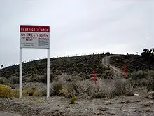Frontera y señal de advertencia del Area 51 en la que se indica que "está prohibido hacer fotografías" y que "está permitido el uso de dispositivos letales" bajo los términos acordados en el McCarran Internal Security Act en 1950. Un vehículo del gobierno está estacionado en la cima; desde allí, los agentes de seguridad observan Groom Lake.