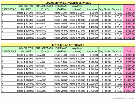 ESCALAS Y CATEGORIAS DEL MONOTRIBUTO 2010 AQUI. El pago mensual de la categoría mínima es de $219 mensuales, mientras que el aporte jubilatorio es de $110 y el monto destinado al sistema de salud se ubica en $70.