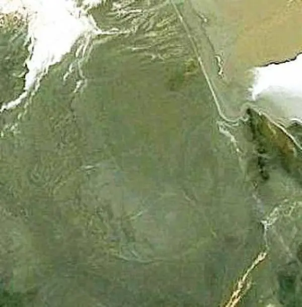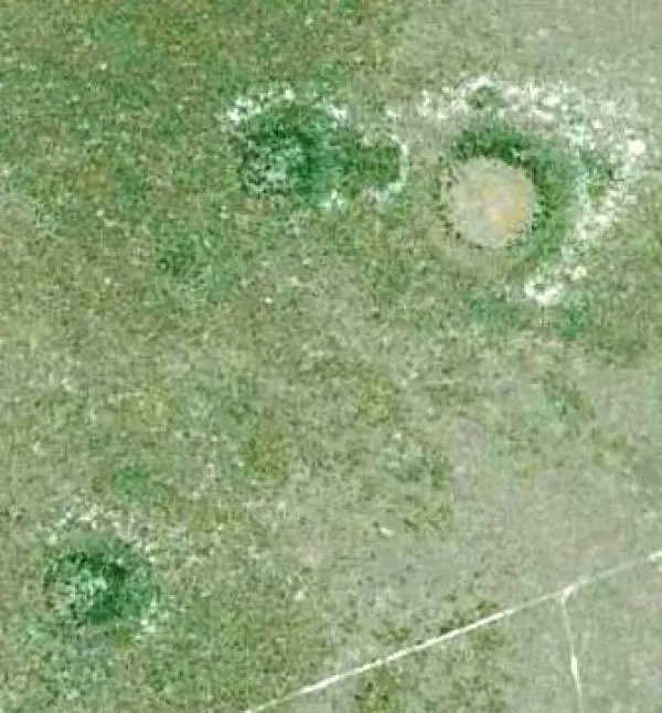 Provincia de Chubut, Patagonia, Arg. Bajada del diablo. En una área de 27 x 15 km aparecen más de cien posibles cráteres de impacto del tipo simple . Se trata de depresiones en forma de taza con el borde sobreelevado con respecto al piso de la geografía local. Catorce cráteres muestran diámetros comprendidos entre los 300 y los 1 000 metros. En muchos casos, se aprecian alrededor de cada cráter Hubicacion 42º 45' S, 67º 30' W. (1300 km de Mtvo.)