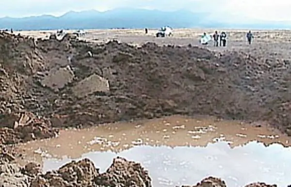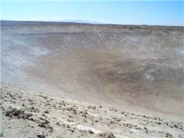 Antofalla, Salar de Antofalla, Catamarca ( Arg) Se trata de una depresión con forma de taza de 750 metros de diámetro ubicada en el borde SE del Salar de Antofalla. Está algo erosionado pero mantiene su forma bien definida. Se calcula su edad en menos de 2 millones de años.Hubicacion S 20º15' W 68º00' (1500 Km.de Mtvo)