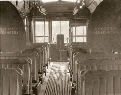 Fotografía de un tranvía de Montgomery, Alabama, tomada en 1930. Los negros debían ocupar los asientos del fondo, tras los separadores rotulados (Colored Passengers). El 1 de diciembre de 1955, también en Montgomery, Rosa Parks se convirtió en un icono del movimiento de derechos civiles al negarse a moverse a la parte trasera del autobús para ceder su asiento a un blanco, tal como dictaba la ley de la época en el sur de EEUU. Fue acusada de perturbar el orden publico y encarcelada por ello.