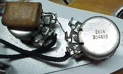 En los potenciometros: En esta foto se ve el potenciometro con una serie de números. Estos no son casualidad. En la tira de abajo se puede apreciar: 304, este era un numero de proveedor que se le asignaba a cada empresa que le proveia materials a Fender. En este caso, la empresa que le proveia los potenciometros era 304. Y los numeros que le sigen son 435. Esto significaba que era la semana 35 del año 54. Este mecanismo fue un poco rebuscado por eso en el 56 fender decide no colocar mas su numero en los potenciometros.