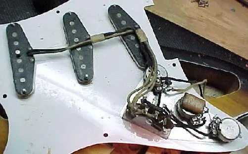 En esta foto se puede ver la conexión de microfonos ensambladas en el chapón de la Stratocaster: