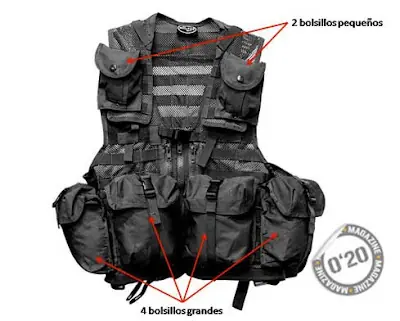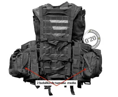Este chaleco, dispone además de un par de bolsillos que van por debajo de los pouchs frontales y que uno puede ser usado como un portamapas/portadocumentos, mientras que el otro incorpora una funda para pistola. Hay que mencionar el entramado MOLLE que incorpora este chaleco modular de Mil-tec, el cual permite la incorporación de nuevos pouchs con un mayor nivel de especialización, tales como botiquín, administradores, sistema hidrobag etc., lo que aumenta enormemente las posibilidades del chaleco modular tipo MOLLE de Mil-tec.