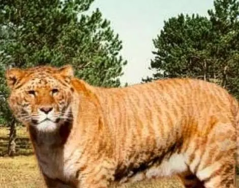 Se ha mantenido por uno de los coleccionistas más emprendedores y naturalistas de nuestro tiempo, el Sr. Carl Hagenbeck, no sólo para reproducirse, pero para llevar con éxito a una madurez sana, las muestras de esta alianza poco común entre los dos grandes felinos y formidable, el león y el tigre. Las ilustraciones se indicará lo suficientemente afortunados como el señor Hagenbeck ha estado en sus esfuerzos para producir estos híbridos. La más antigua y más grande de los animales que se muestra es un híbrido nacido el 11 de mayo de 1897. Esta bestia bien, ahora más de cinco años de edad, es igual e incluso se destaca en sus proporciones y un león adulto, de medida como lo hace desde la punta de la nariz a la cola de 10 pies 2 pulgadas de largo, y de pie sólo tres pulgadas menos de 4 pies en el hombro. Un gran león buena pesará cerca de 400 libras [...] el híbrido de que se trate, con un peso como lo hace no menos de 467 libras, es sin duda el superior de los leones más bien crecido, ya sean salvajes criados o nacidos en una casa de fieras . Este animal muestra rayas débiles y manchas, y, en sus características, presenta fuertes huellas de sus dos padres. Tiene una cabeza de león, como un poco, y la cola es más parecida a la de un león que de un tigre. Por otra parte, no tiene rastro de melena. Es una bestia muy poderosa y enorme.