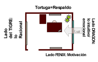 De acuerdo al feng shui de las formas, un sitio auspicioso se encuentra siempre protegido por detrás y por los lados, denominados simbólicamente el Tigre (a la derecha), la Tortuga (por detrás) y el Dragón (a la izquierda). El frente, denominado Fénix , se encuentra despejado y permite una amplia visión. En el ejemplo de la derecha, la Tortuga (respaldo) está representada por los diplomas que acreditan al profesional que usa el escritorio, muchos abogados colocan detrás de su escritorio una biblioteca con libros (su respaldo de conocimientos). Una ventana detrás del escritorio le quita respaldo a quien se ubique allí.