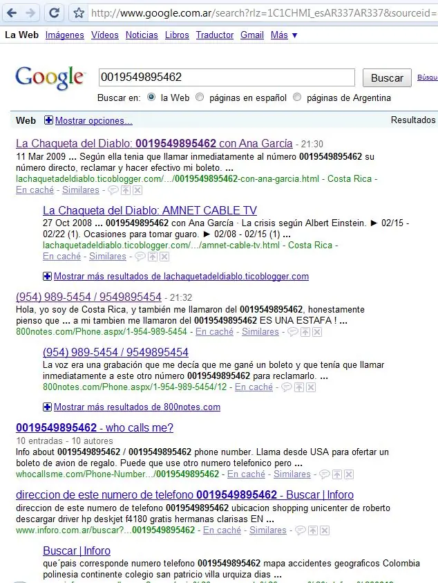 4) El teléfono fue atendido por mi hermana quien en forma rápida me pidió que escribiera el siguiente numero 0019549895462. En dicha grabación solicitaba que llamemos por teléfono a ese número para que se acredite el viaje gratis. Yo al tener al alcance la notebook se me prendió la lamparita y googleé el número.