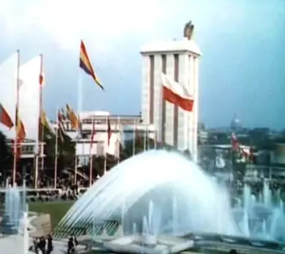La bandera republicana del pabellón español ondea entre las de los gobiernos totalitarios soviético y nazi. Ironía de la guerra fratricida que en esos momentos desgarraba España.