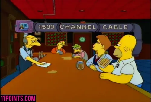 11.- Cientos de canales de televisión por cable: En la caverna de Moe se aprecia como se ofertan mil 500 canales; en la actualidad existen canales para infinidad de gustos.