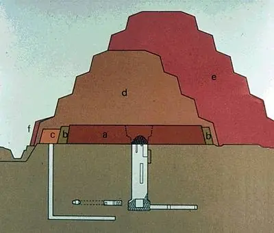 * Según Lauer, durante el segundo plan, la cámara intermedia era la destinada a cumplir la función de cámara funeraria y la galería estaba construida como un corredor sin salida, en el cual se almacenaban los bloques de granito que obstruían todo el corredor ascendente.