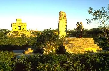 Imagen de la "Estela 7" que tiene de fondo el "Palacio de las 7 doncellas" el cual también presenta un importante alineamiento astronómico.