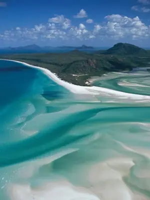 Seis kilómetros de arena tan blanca que enceguece bordean un mar de aguas profundamente turquesas. En el extremo norte, la costa se adentra formando una increíble bahía conocida como Hill Inlet.