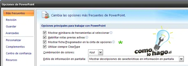 Para hacer esto, al menos en Powerpoint 2007, es necesario activar una pestaña llamada Programador que no viene por defecto, pero que les enseñaremos a marcar en solo segundos. En 2003, el procedimiento es distinto y lo veremos en su momento.
