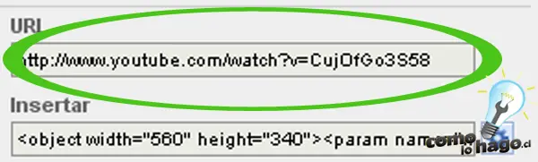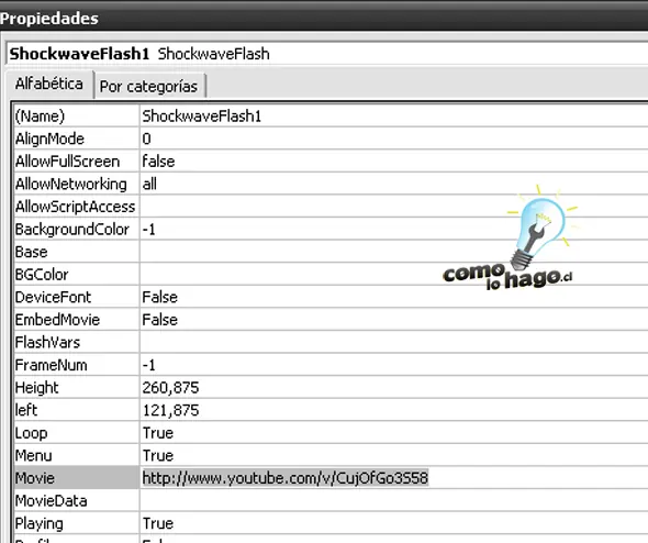 10.- Esta URL debemos pegarla en la ventana de propiedades, en Movie. Sin embargo, debemos hacer una pequeña modificación antes de cerrar. Es necesario a la URL eliminarle la palabra watch, el signo de interrogación y cambiar el signo = por un / . Por ejemplo, para la URL que mostramos en la imagen anterior: