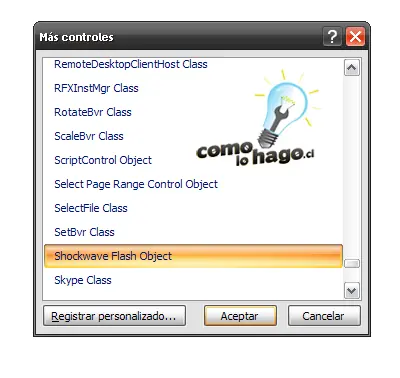 5.- A continuación se abrirá la ventana de controles, en la cual debemos buscar al opción Shockwave Flash Object y hacemos click en Aceptar: