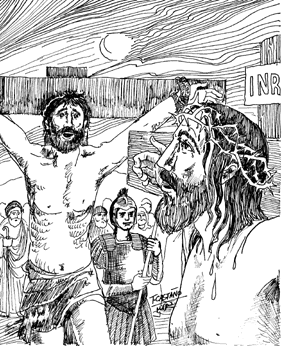 Dieron de beber a Jesús vino con hiel. Él probó pero no quiso tomarlo. Tras crucificarlo, los soldados se repartieron sus vestiduras. En la cruz, sobre su cabeza, pusieron un cartel en arameo, griego y latín con el motivo de su condena: "Este es Jesús, el Rey de los Judíos", que a menudo en pinturas se abrevia INRI ("Iesus Nazarenus Rex Iudaeorum", literalmente "Jesús de Nazaret, Rey de los Judíos". Fue crucificado entre dos ladrones.