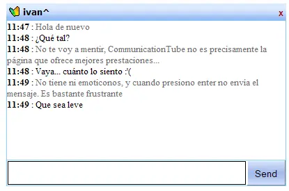 CommunicationTube es especialmente modesto. Ni tan siquiera permite mover las ventanas, algo que no es estrictamente necesario, pero que te hace sentir menos dentro de una página web. Su simpleza tiene una parte positiva: funcionará en navegadores anticuados o limitados, incluidos los de videoconsolas y teléfonos móviles.