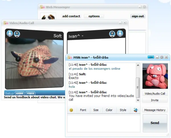 te permite conversar con tus contactos de las redes de mensajería más populares: MSN, Google Talk, Yahoo e ICQ. La apariencia es agradable y dispone de avisos auditivos (algo desagradables, todo sea dicho). Puedes hacer videollamadas sin tener que registrarte aunque, como ocurre con todas estas aplicaciones web, no se hace desde el sistema propio de MSN, sino desde una página web.