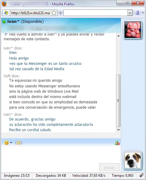 El aspecto de MessengerFX es también bastante agradable, lo cual disimula su carencia de funciones. Soporta el formateo de texto y poco más. Ahora bien, si sólo quieres intercambiar unos cuantos mensajes, es más que suficiente. Eso sí, el primer mensaje que enviará a tu contacto será informando de que estás usando messengerfx.com.