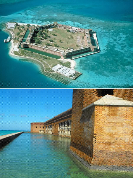Una fortaleza militar, en el océano, con un foso! Fort Jefferson es una parte del Parque Nacional Dry Tortugas en las aguas de Key West, Florida. La construcción del fuerte "en el medio de la nada" se inició en 1846. Fue originalmente concebido para la defensa de los EE.UU., pero durante los 30 años de construcción, algunas características de diseño se convirtió en obsoleta a tal efecto.