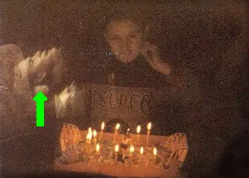 Minutos después de apagar las luces para festejar el cumpleaños de este chico se le tomo esta espectacular fotografía, la cual muestra a una persona recostada sobre el diván en el que estaba sentado este chico. La otra fotografía fue tomada segundos antes de apagar las luces y no muestra a nadie allí.