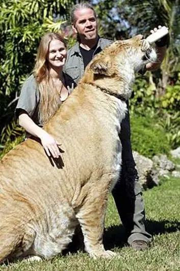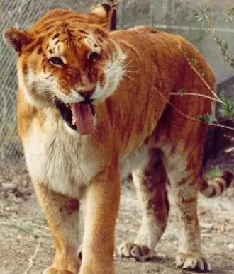 El ligre es el híbrido producto del cruce entre un león y una tigresa. Su aspecto es el de un gigantesco león con rayas de tigre difusas. Al igual que los leones, los ligres macho desarrollan melena. El ligre generalmente llega a medir hasta 4 metros y llegar a pesar hasta 400 kilogramos, llegando a poseer un tamaño mayor que su padre (león) y su madre (tigresa); esto se explica fácilmente debido a que el gen inhibidor del crecimiento se transmite por vía materna en los leones y paterna en los tigres, por lo que el ligre no hereda ningún gen de este tipo y crece durante toda su vida. Las patas y cola, por el contrario, son cortas en relación al cuerpo, ya que sí dejan de crecer; por ello, es posible que los ligres machos más ancianos lleguen a quedar impedidos para caminar al no poder sostener su propio peso.