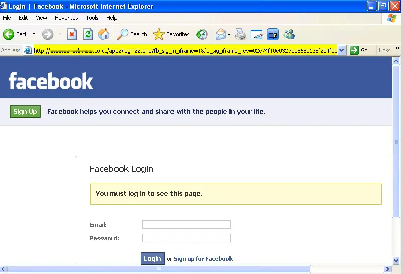 Ahora que los cibercriminales han atraído la atención del usuario, necesitan su nombre de usuario y contraseña para iniciar la siguiente fase del ataque. El enlace de la aplicación en la que han hecho click parece exactamente igual que la página de entrada de Facebook, pero en realidad es una copia alojada en otra dirección web:
