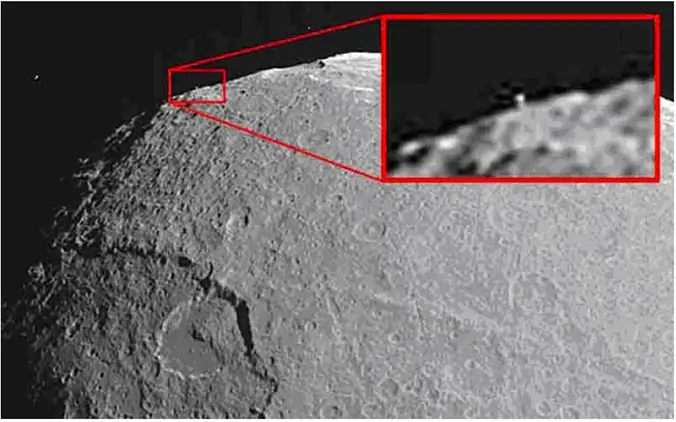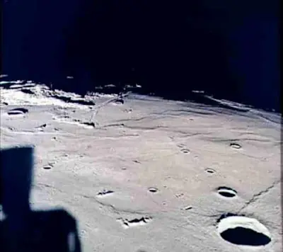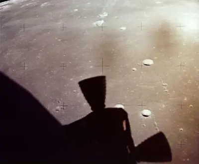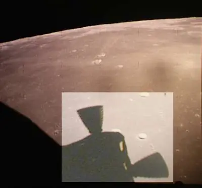 dijo:"Segun la NASA, la extraña silueta que aparece en la foto, tomada desde el Módulo Lunar a 95 Km de la superficie lunar, es la sombra proyectada por el cohete del Módulo de Mando. Pero cuando un avión de gran tamaño vuela a baja altura sobre la Tierra, no proyecta sombras tan enormes y definidas."