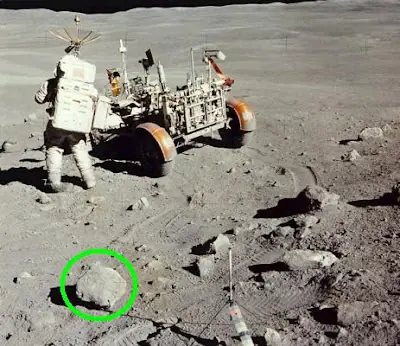 dijo:"Y hablando de decorados -sigue Camacho-, si analizásemos en detalle esta otra imagen encontraríamos muchas cosas, pero nos vamos a centrar sólo en una de ellas. En esta piedra que hay en la esquina, que tiene algo que parece una C. La NASA dijo que era un pelo, que se les había colado al escanear la diapositiva. Lo realmente sospechoso es que se ha retocado la imagen, y la versión que actualmente podemos encontrar si vamos a la página web de la NASA no muestra nada en la roca".