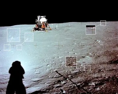 dijo:Seguimos ahora con los objetos "extraños y nunca identificados" que aparecen sobre el visor de Aldrin.