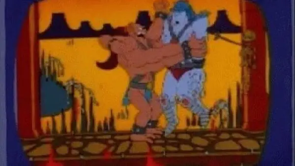 5. Bonestorm (“Marge, no seas orgullosa”). ¿Qué niño de 10 años puede resistirse a un juego plagado de sangre, desmembramientos y la violencia más brutal? Bart Simpson no, desde luego. Bonestorm guarda un sospechoso parecido a primera vista con Mortal Kombat, y no lo decimos por ese fondo con esqueletos empalados o ese personaje que parece primo segundo de Goro, no. El caso es que Bart está dispuesto a lo que sea por hacerse con ese cartucho. Lo que sea. Pero aprenderá que los malos actos tienen graves consecuencias. Consecuencias como conformarse con jugar a …