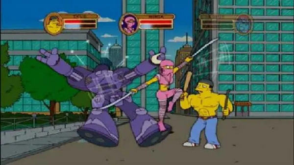 9. Death Kill City II: Death Kill Stories (“Cuerdas gañanes”). ¿No está suficientemente clara la referencia a GTA? En el capítulo “Cuerdas gañanes” incluso se muestra la carátula del juego, que no puede ser más reveladora. Eso sí, ahí terminan las coincidencias, porque Death Kill City II es un juego de lucha entre al menos tres personajes simultáneos con personajes de lo más dispares. Ni qué decir tiene que triunfa entre el público infantil. ¿Debería Rockstar tomar nota e incluir robots de dos metros y chicas ninja? Quién sabe…