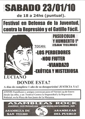 Los medios dicen, de Luciano y de otros, “habría desaparecido”, “hay que chequear la veracidad de la información” o que “no es primicia y por eso no lo podemos publicar”. Es la tibieza que no tienen cuando afirman: “Aumento la inseguridad”, “1 crimen cada 4 minutos” o “La crisis causo dos nuevas muertes, los piqueteros se mataron entre ellos”. Nunca escucharemos, ni en el canal, la radio o el diario comercial mas progresista “la policía mata y tortura todos los días en sus comisarías”.