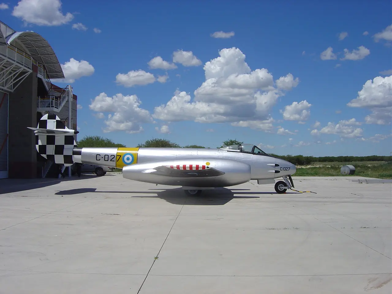 Se trataría del Meteor C-093 desactivado el 30/12/70 y trasladado por vía terrestre hasta la localidad de José C. Paz (Bs. As.), expuesto sobre un pedestal en el acceso principal de la actual VII Brigada Aérea, con matrícula ficticia C-099.