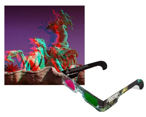 Si miras a una pantalla sin gafas con imágenes 3D, podrás ver como hay dos combinaciones de imágenes superpuestas y ligeramente desincronizadas en posición. Una de ellas tendrá un tono azul mientras que la otra será roja. Al ponerte las gafas 3D, ves como las dos imágenes convergen para convertirse en una sola pero con profundidad.