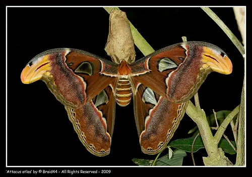La mariposa atlas (Attacus Atlas) es considerada la polilla más grande de las existentes: el área total de sus alas ocupa más de 400cm2. Su hábitat se extiende desde el sudeste asiático hasta indonesia y es muy común en el archipiélago malayo y Tailandia.