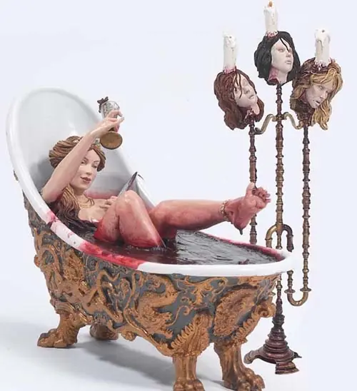 La muerte de Ferenc en 1604 fue el punto de inflexión definitivo en la espiral de violencia de Isabel, que al verse viuda dio rienda suelta a toda su psicopatía. Con la ayuda de su cómplice Darvulia, una supuesta bruja de la región, montó un siniestro laboratorio en los sótanos del castillo y se dedicó a las prácticas de magia negra. Entre los aparatos de tortura que supuestamente guardaba en las mazmorras había un autómata llamado La Virgen de Hierro, una dama metálica con un mecanismo que clavaba puñales, además de diversos atizadores enrojecidos al fuego, ganchos y todo lo que la imaginación pueda concebir en estos casos. La razón de esta sinrazón es que Isabel quería mantenerse bella y joven para siempre (tenía 44 años, que en aquella época era casi la tercera edad), y la fuente para obtener la eterna juventud era la sangre de las chicas a las que torturaba. Bebía su sangre, se daba baños de sangre, arrancaba su carne mientras sus sirvientas las sujetaban y cometía actos tan atroces que resultan casi imposibles de creer.