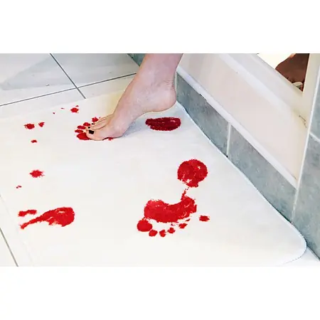 Transforma tu baño en la escena del crimen con esta alfombrilla blanca con manchas rojas que parecen sangre. Tus invitados se llevarán un susto de muerte.
