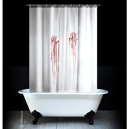 Esta cortina de ducha al estilo Psicosis tiene manchas de manos ensangrentadas. Un accesorio que convertirá cualquier baño es un escenario de peli de terror.