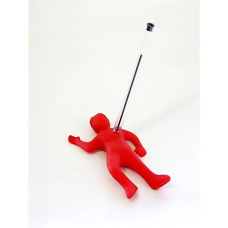 "Dead Fred" es un soporte de bolígrafos de sobremesa. Alivia tu estrés apuñalándole repetidamente. No se queja, y encima te sostiene el boligrafo.