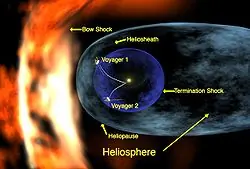 Esta capa se debe al encuentro entre las partículas eléctricas producidas por el Sol, denominadas viento solar, con las partículas eléctricas del medio interestelar. Por tanto, las sondas Voyager se han convertido en los instrumentos artificiales más lejanos jamás enviados por el hombre. Las naves contienen generadores eléctricos nucleares que permiten que sigan funcionando sus instrumentos científicos. A finales de 2003 la Voyager 1 envió datos que indican que podría haber atravesado esta barrera. Estos datos están sin embargo en disputa. El 15 de agosto de 2006 la sonda Voyager 1 alcanzó la distancia de 100 UA, esto es, se encuentra a más de 15.000 millones de km del Sol. Actualmente, debido a problemas de presupuesto, el proyecto es controlado por un grupo de tan sólo 10 personas pertenecientes al Jet Propulsion Laboratory, y podría ser abandonado en un futuro próximo junto con otras misiones, dejando a ambas sondas seguir su camino sin que haya nadie que las escuche en la Tierra.