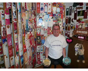 Las colecciones siempre han tenido un papel importante en el buzón de solicitudes de Guinness World Records™, pero una de nuestras favoritas es la del contable y auditor Jean Francois Vernetti (Suiza). Jean Francois colecciona señales de «No molestar» desde abril de 1985, cuando descubrió un error ortográfico en una señal de «No molestar» de un hotel en el que estaba alojado en Sheffield (Inglaterra). «Fue graciosísimo», dice riéndose. «Me pareció tan graciosa que me la llevé a casa y la enseñé en el periódico local, que publicó una foto de la señal». Jean Francois insiste en que siempre pregunta antes de llevarse las señales y, entre sus diseños favoritos, están una señal con forma de pajarita y un aviso de un hotel de Hawaii hecho totalmente de marisco. «Guardarlas es una buena forma de recordar dónde has estado. Cada señal te trae un recuerdo especial», dice. El récord apareció por primera vez en el libro Guinness World Records de 2003, con la noticia de que la colección de Jean había alcanzado 1.750 señales diferentes hasta el 8 de febrero de 2002. Actualmente, cambia de hoteles durante sus viajes con el propósito de añadir más señales a su espectacular colección, que ahora mismo tiene 10.000 señales diferentes de «No molestar» procedentes de hoteles de 198 países.