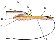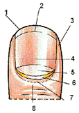 La uña, es una lámina plana y convexa que recubre y da protección a la pulpa de los dedos. Esta lamina formada por varias capas de queratina, reposa sobre el lecho epidérmico y tiene 4 bordes: 2 bordes laterales que se insertan en los surcos laterales donde se encuentran los repliegues epidérmicos. -El borde distal que acaba en el borde libre de la uña y la línea amarilla formada por la sustancia cornea plantar que marca el principio del borde libre. y En el borde proximal, debajo del repliegue de la epidermis encontramos la matriz proliferante zona de origen y producción de la uña. Esta zona es fácilmente diferenciable por su color rosa más blanquecino debido a su mayor grosor y lleva el nombre de lúnula. El repliegue cutáneo denominado ungueal posee dos caras: una dorsal y otra ventral. Las capas corneas de ambas caras forman una expansión llamada cutícula y tiene como función proteger la uña. Las uñas son una subespecialización de la piel, en concreto de la epidermis, de hecho comparte con ella su principal componente: la queratina, la principal diferencia entre la epidermis y la uña es el porcentaje de agua, la primera contiene un 85% y la uña tan solo un 12%.