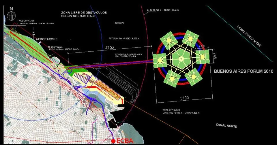 El nuevo conjunto urbano pretende convertirse en un polo de atracción internacional, ya que se plantea en un espacio contenedor de seis plataformas cuadradas separadas entre sí, apoyadas mediante pilotes en el subsuelo del Río de la Plata, permitiendo ello el libre flujo de la corriente fluvial, evitando así generar obstáculos medioambientales inaceptables. Dichas plataformas, de más de 55 hectáreas cada una, sumadas a una única plataforma exagonal central de 66 hectáreas, totalizan una superficie de 400 hectáreas, en las que se implantará el conjunto urbanístico y el Puerto de Cruceros.