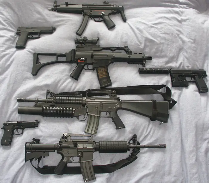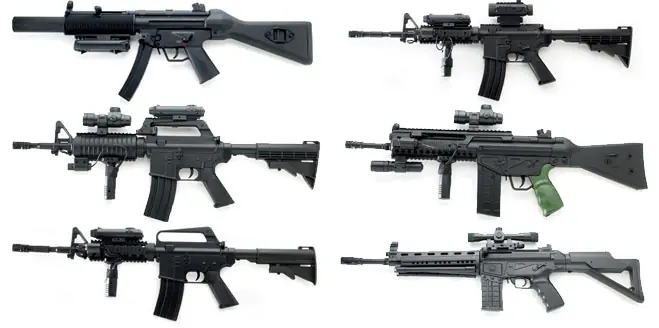 Las réplicas usadas en el airsoft suelen ser réplicas de armas de fuego reales, excepto que estas réplicas están diseñadas para disparar proyectiles de 6 u 8 mm de diámetro.