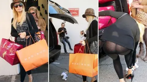 Paris Hilton sigue mostrando más de la cuenta. La millonaria ahora no dudó en salir de compras por el centro comercial Madison, en Beverly Hills, solo con unos leggins negros transparentes que dejaron al descubierto que no llevaba ropa interior.