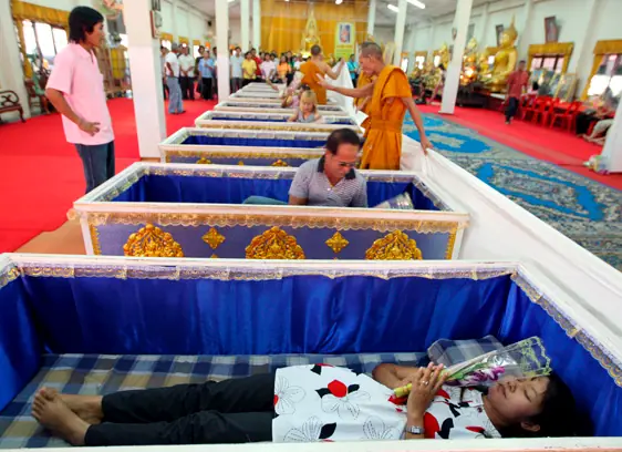 "Los participantes tienen que tumbarse en los ataúdes y simular que están muertos para deshacerse de la mala suerte y el mal karma que arrastran incluso de cualquier mala acción efectuada en una vida anterior", explicó a Efe el venerable monje Kaew Kantasrilo, de 36 años.