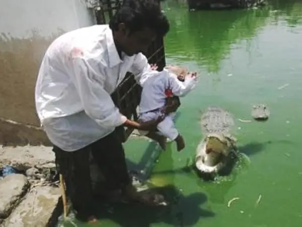Padre acerca a su bebé a colmillos de cocodrilo por rito religioso: