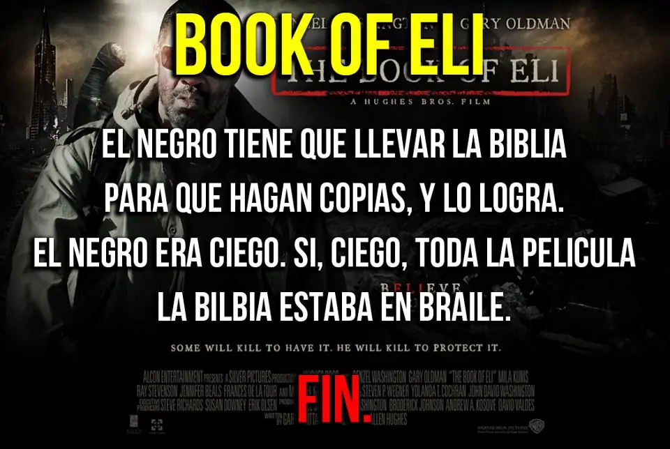 loco o yo entendi para la mierda o vi otra pelicula jajaja, no me parecio que el negro sea ciego, lo vi por el lado mas "mistico y flashero" , el negro que tenia una mision y era hacer que la biblia (que era la ultima que quedaba), sea editada de nuevo, entonces como que el negro ya habia "muerto" por asi decirlo , pero hasta que su mision no se completo , no accedio a la muerte , lo del braile puede ser una casualidad, no hace falta ser ciego para sab…