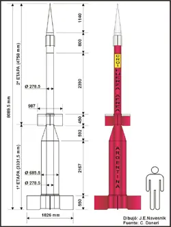 Se trataba de un proyectil de dos etapas mucho más sofisticado que el Alfa Centauro, cuyas dimensiones eran 3,81 metros de largo total por 79,5 centímetros de diámetro máximo y 47,3 kilogramos de peso almomento del lanzamiento. El largo de la primera etapa era de 1,79 metros con un diámetro de 0,094 y una envergadura de 0,50. El peso de la carga útil apenas superaba los 3 kg y el impulso específico del vector fue de 200 segundos, alcanzando una altura máxima de 25 kilómetros.